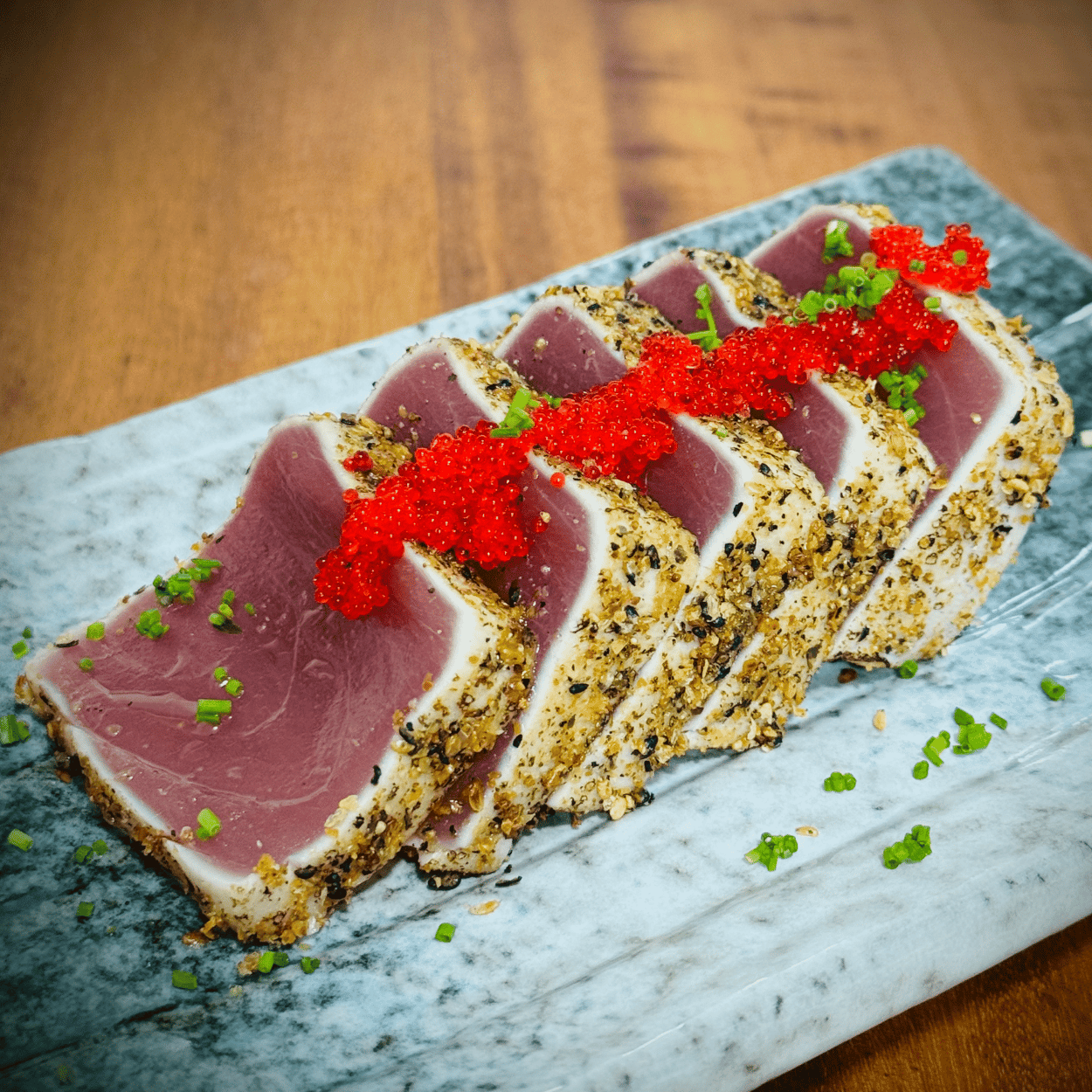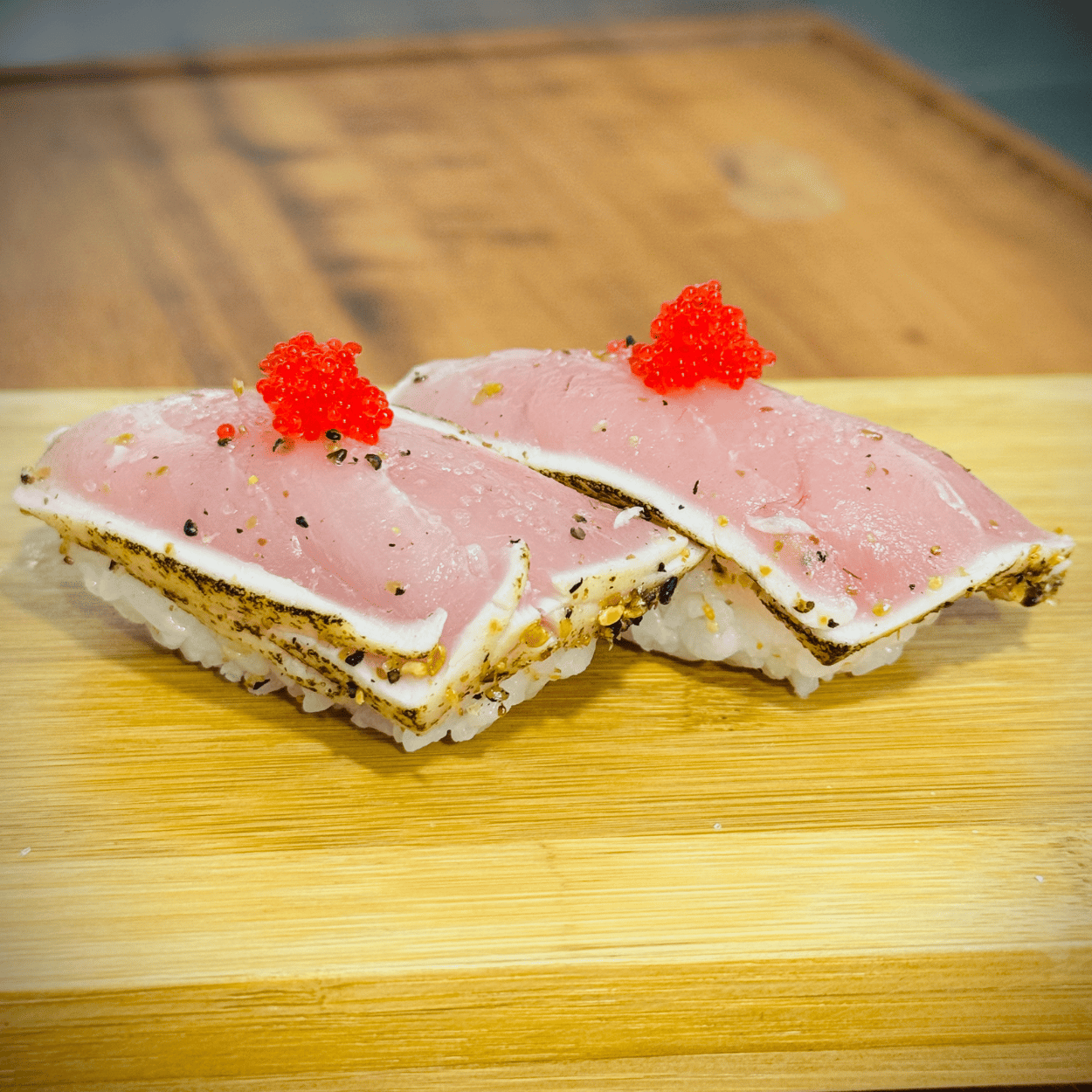3 ABURI MAGURO NIGIRI (Atum selado com azeite trufado, ovas de tobiko vermelhas e gergelim)