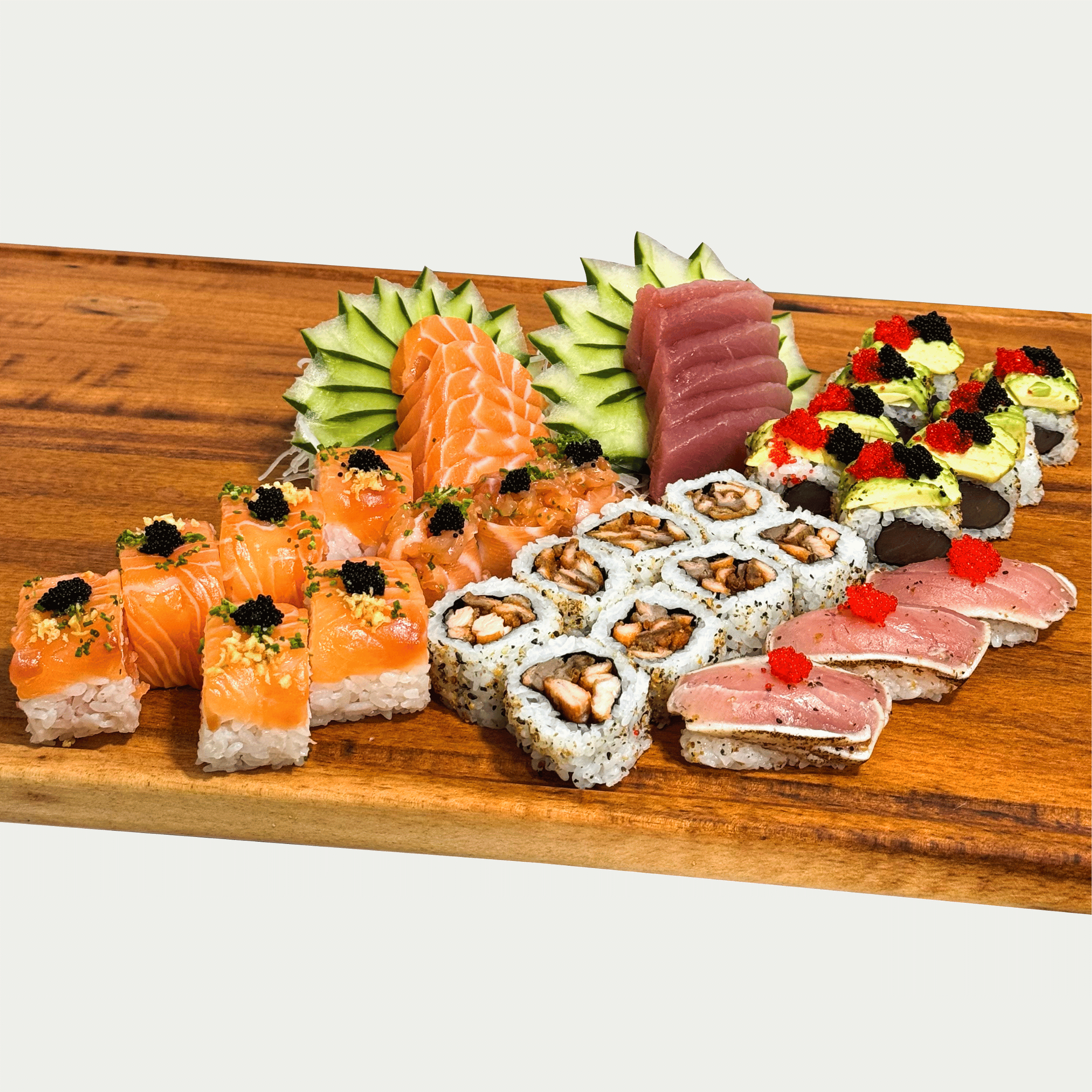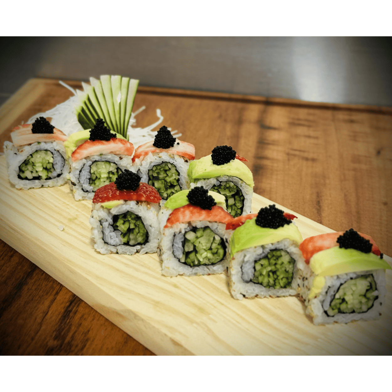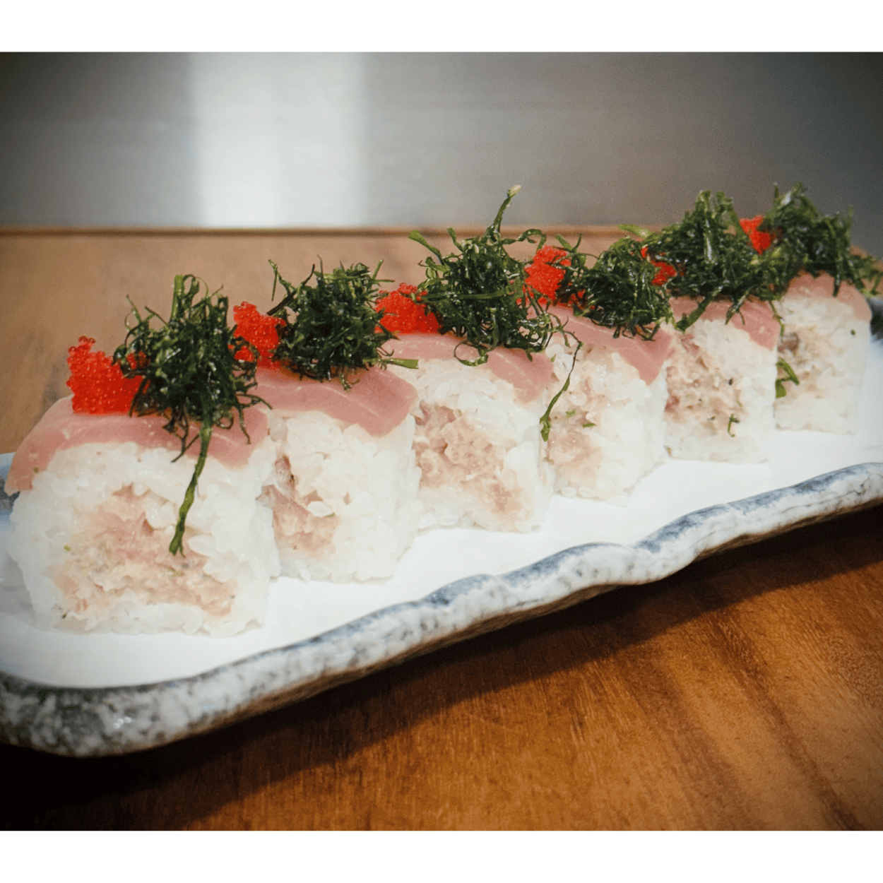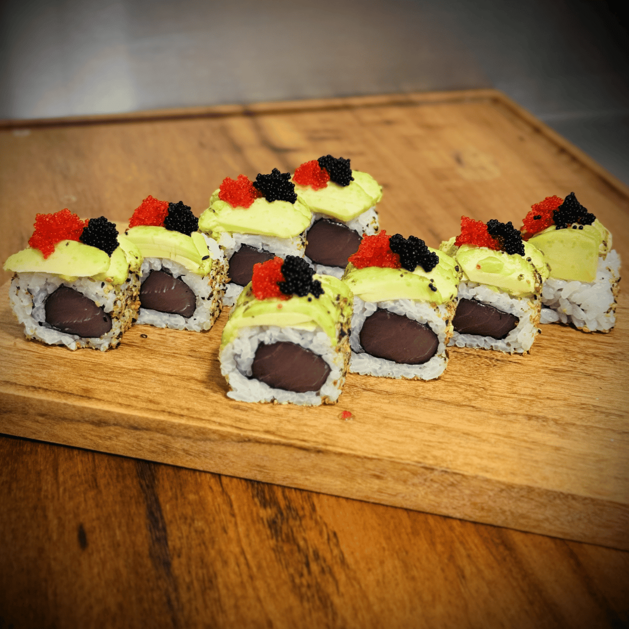 8 MAGURO AVOCADO ROLL (Atuam, avocado e ovas de tobiko pretas e vermelhas)