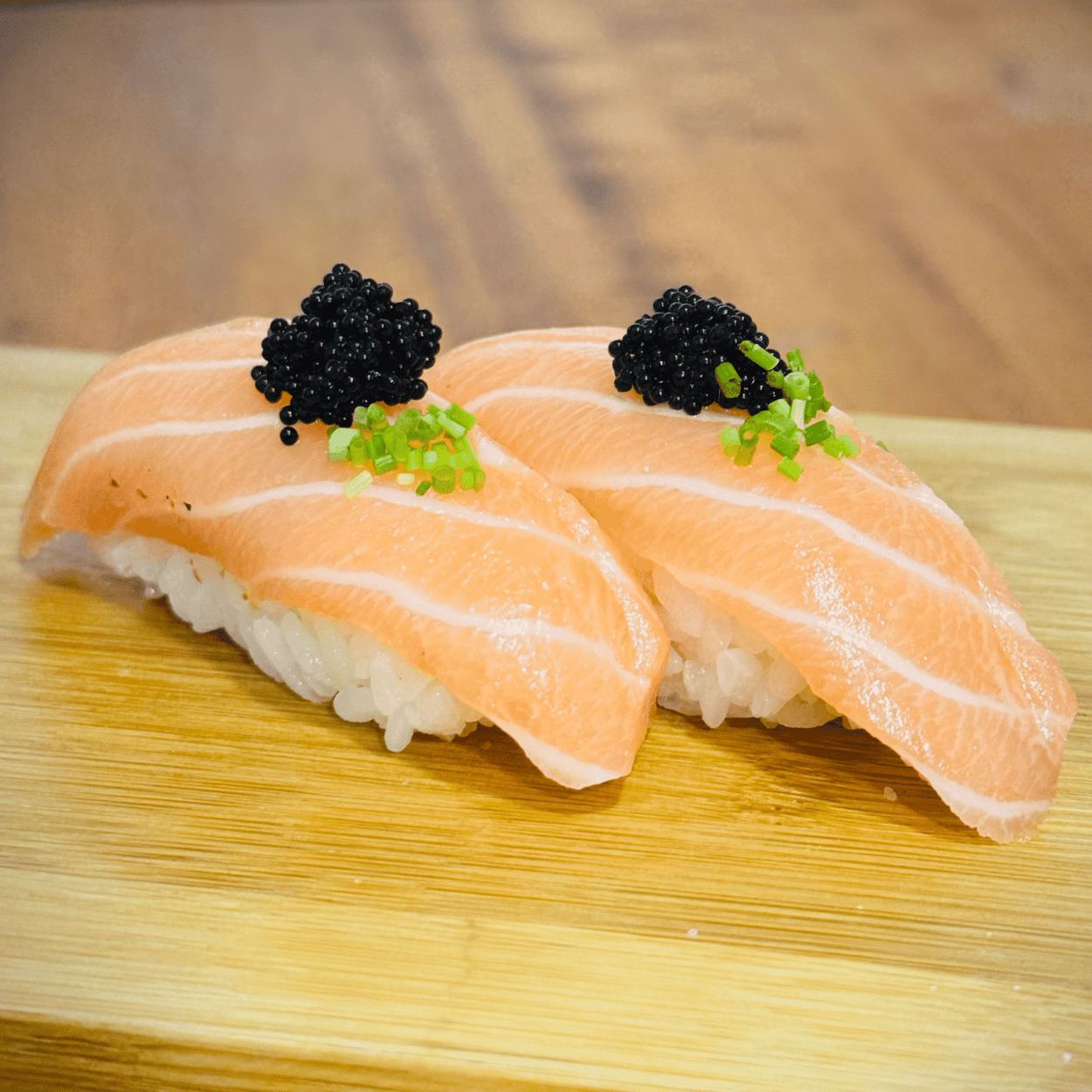 2 SAKE NIGIRI (Salmão e ovas de tobiko pretas)