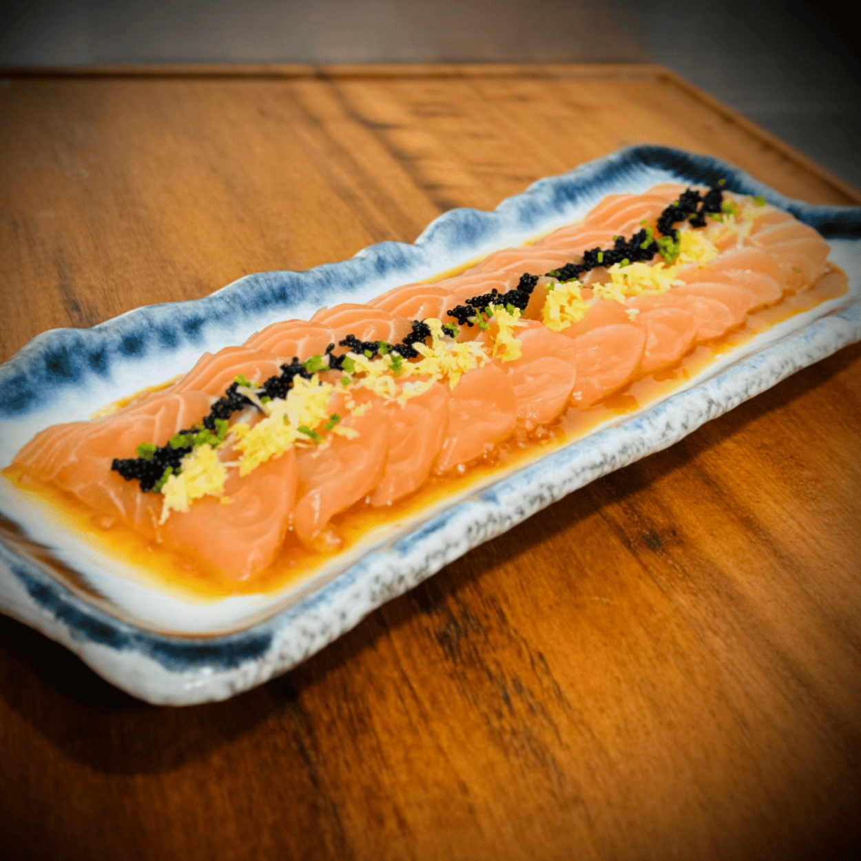4 ABURI SAKE SASHIMI (Salmão selado e ovas tobiko pretas)