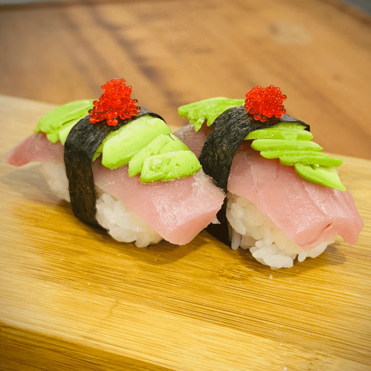 4 MAGURO AVOCADO NIGIRI (Atum, avocado e ovas de tobiko vermelhas)